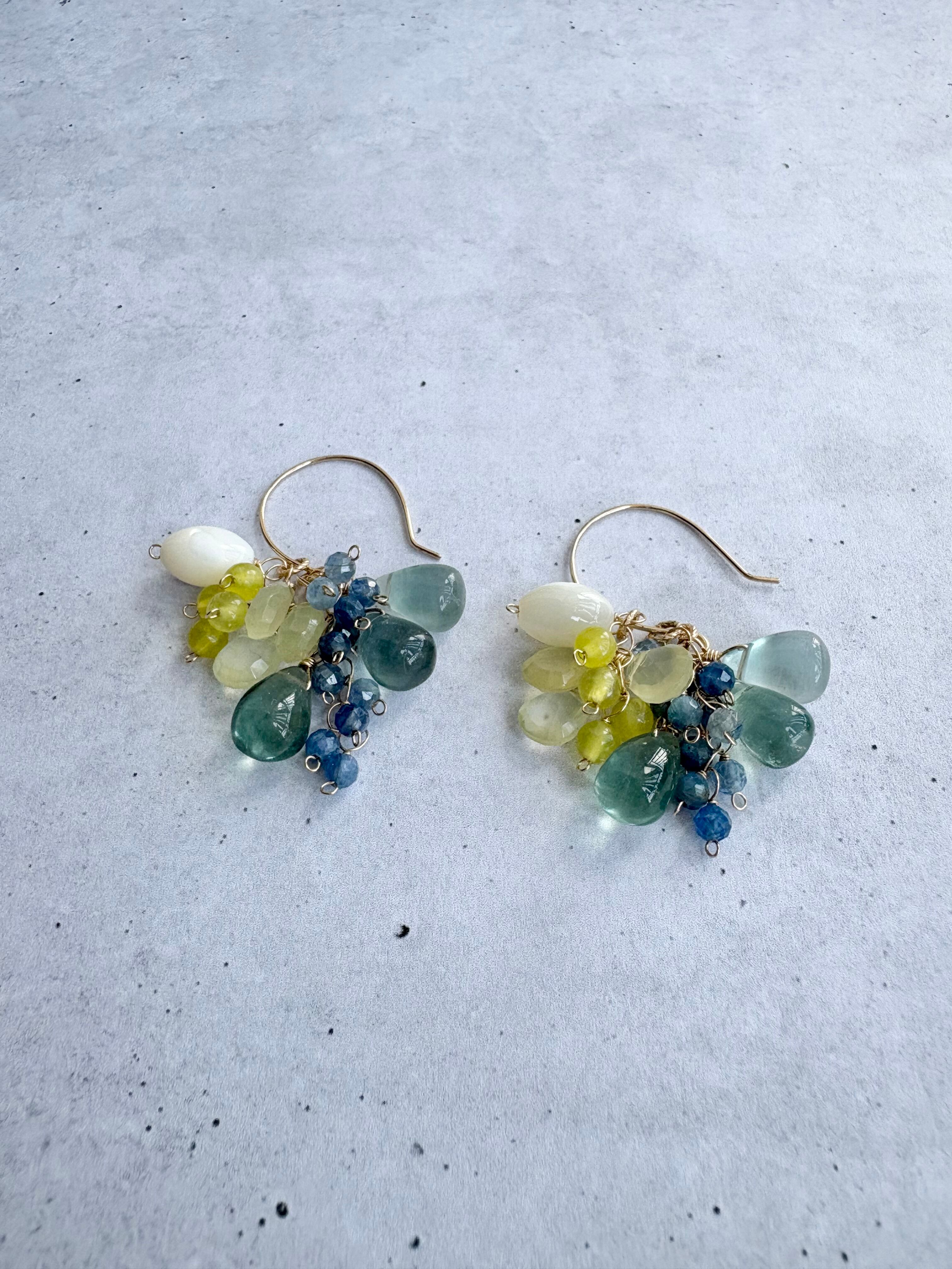 瑞々しいフローライトに夏らしいカラーを組み合わせた付け替え可能なピアスです。