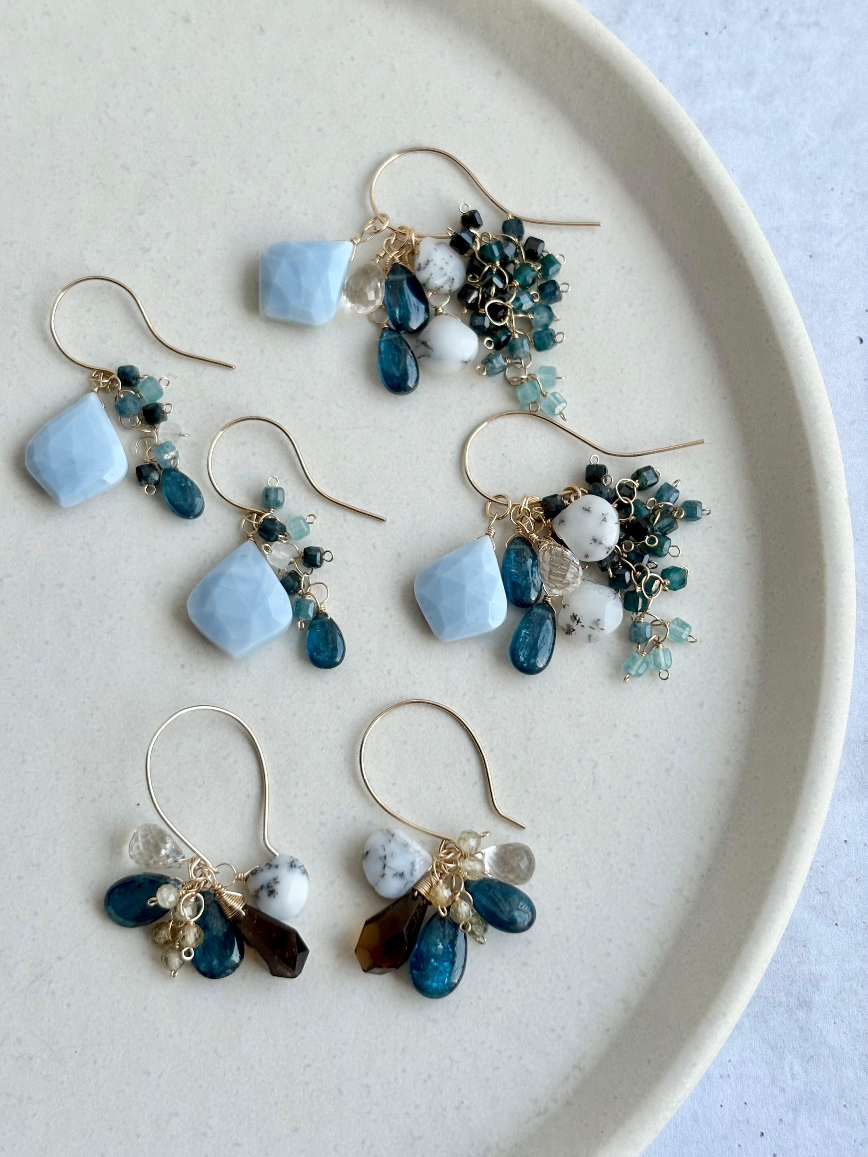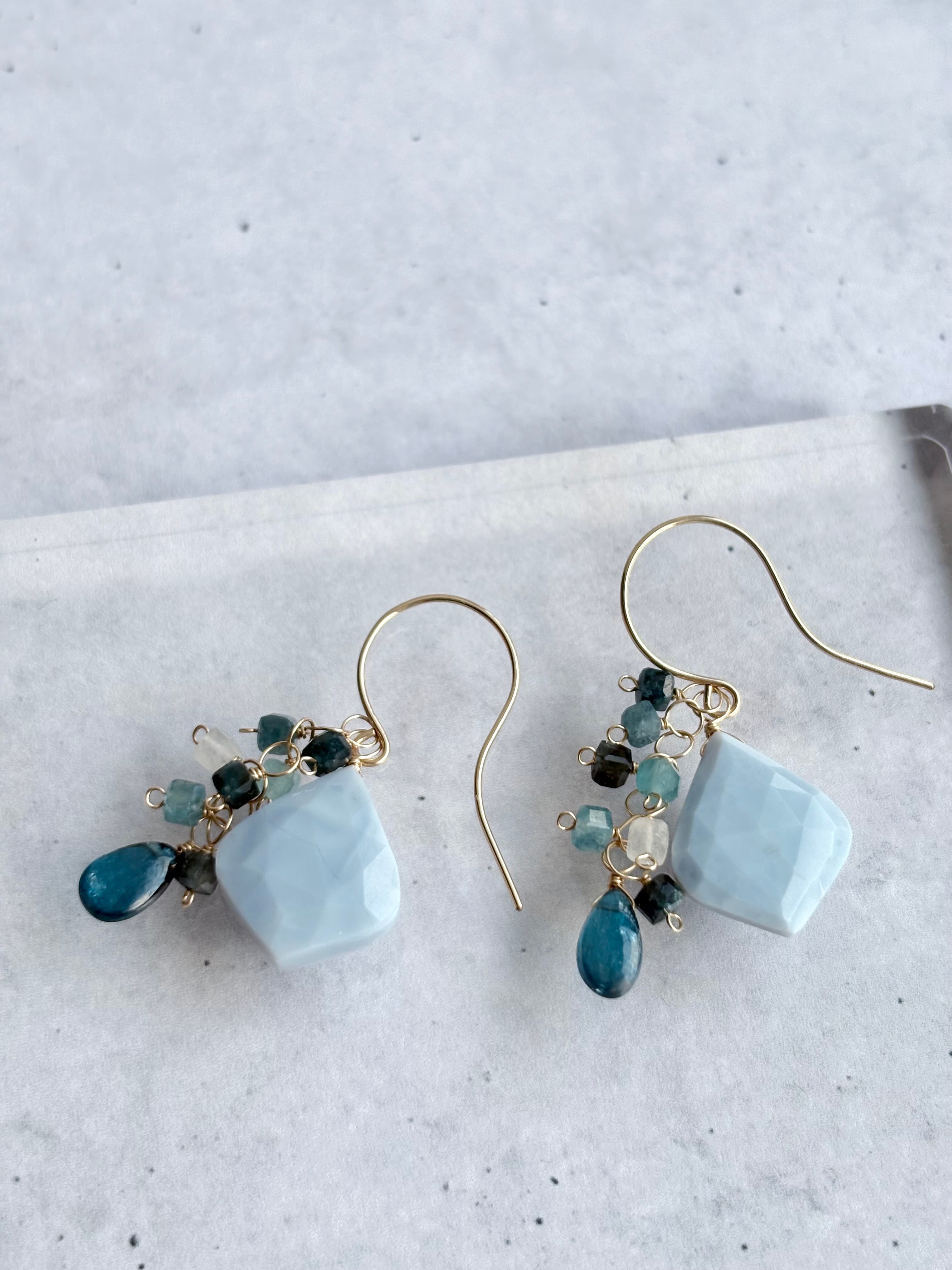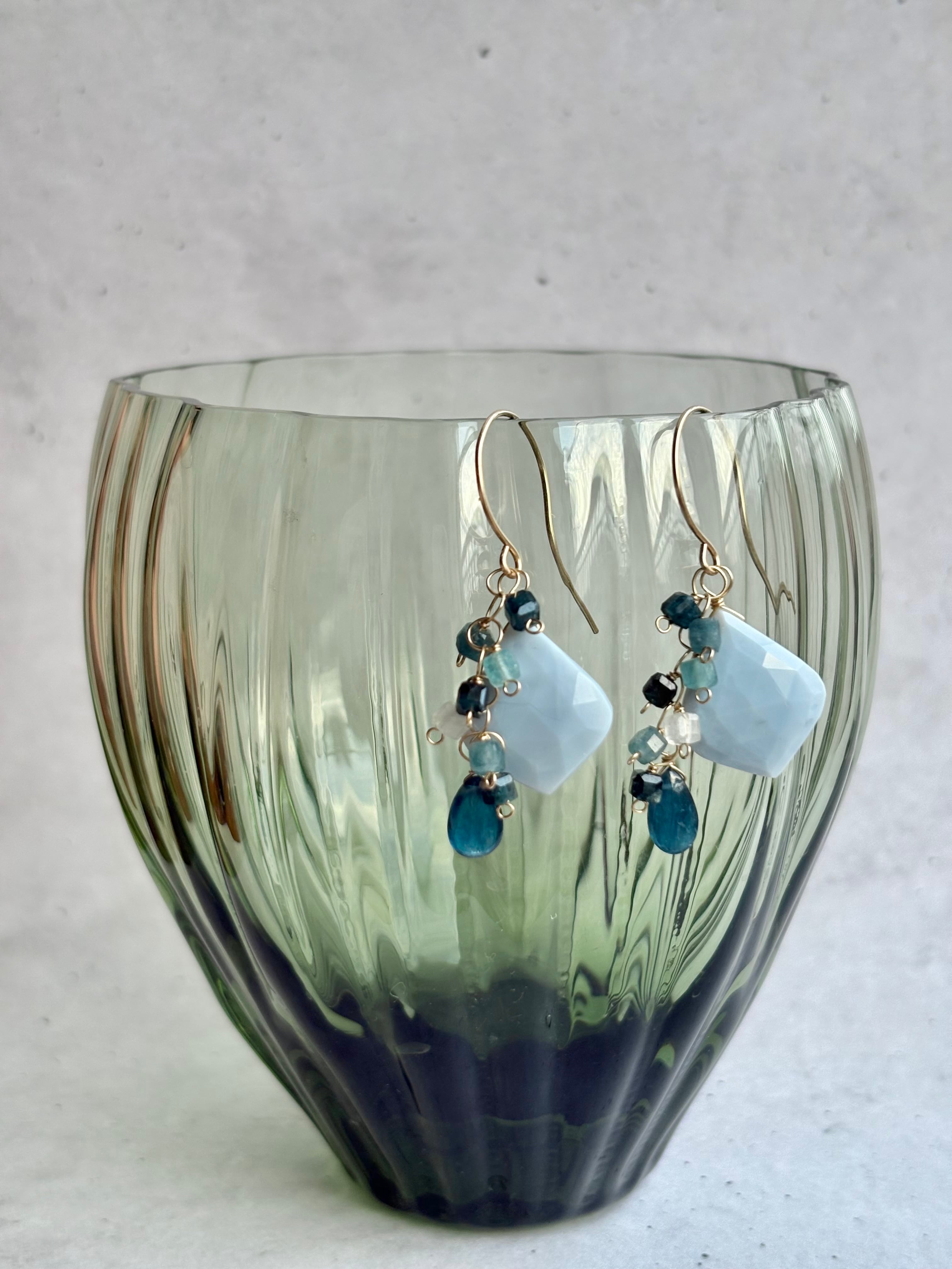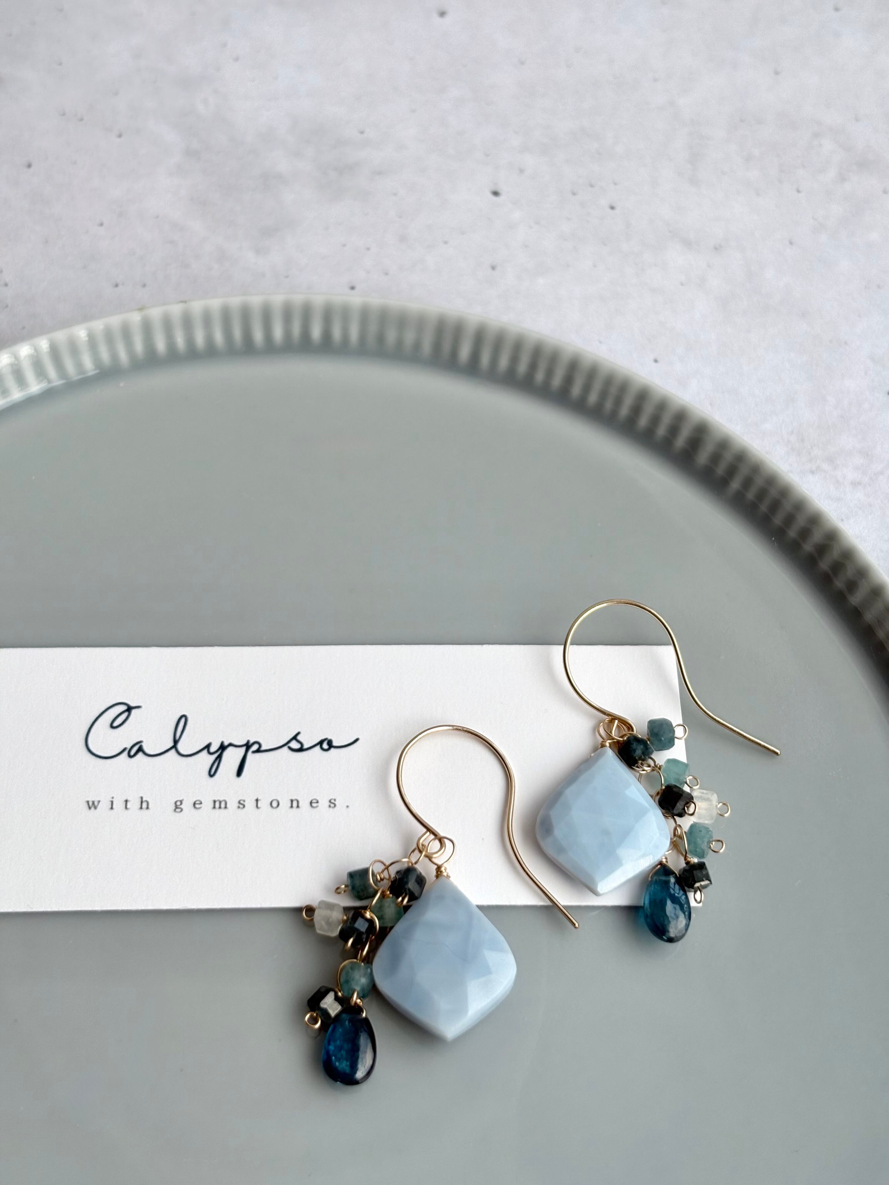 優しい水色のブルーオパールに深みのある最高品質のインディゴブルーカイヤナイトや小粒のインディゴライトトルマリンを合わせたピアス。