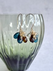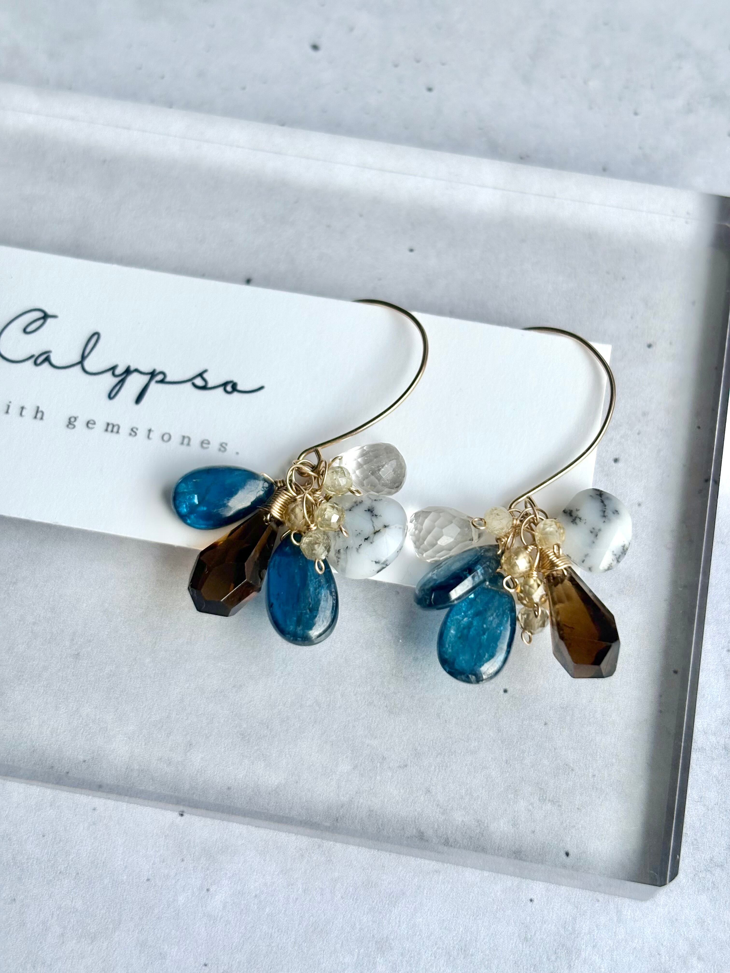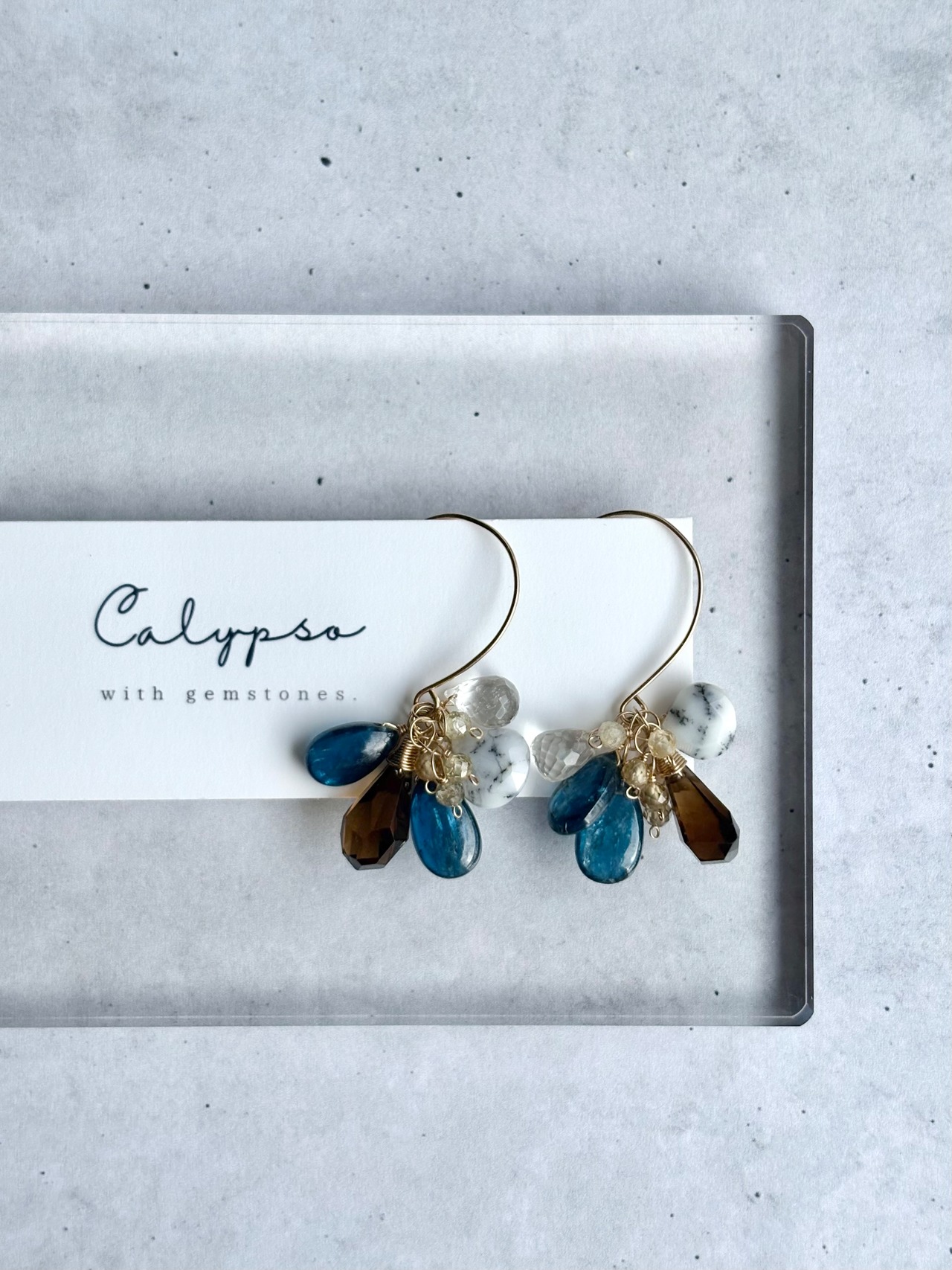 濃いブラウンのビアクォーツに発色が美しい最高品質のインディゴブルーカイヤナイトなどを組み合わせたピアスです。