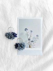小粒の天然石を一粒一粒ラメ糸で編んだ小さな結晶のような耳飾り。