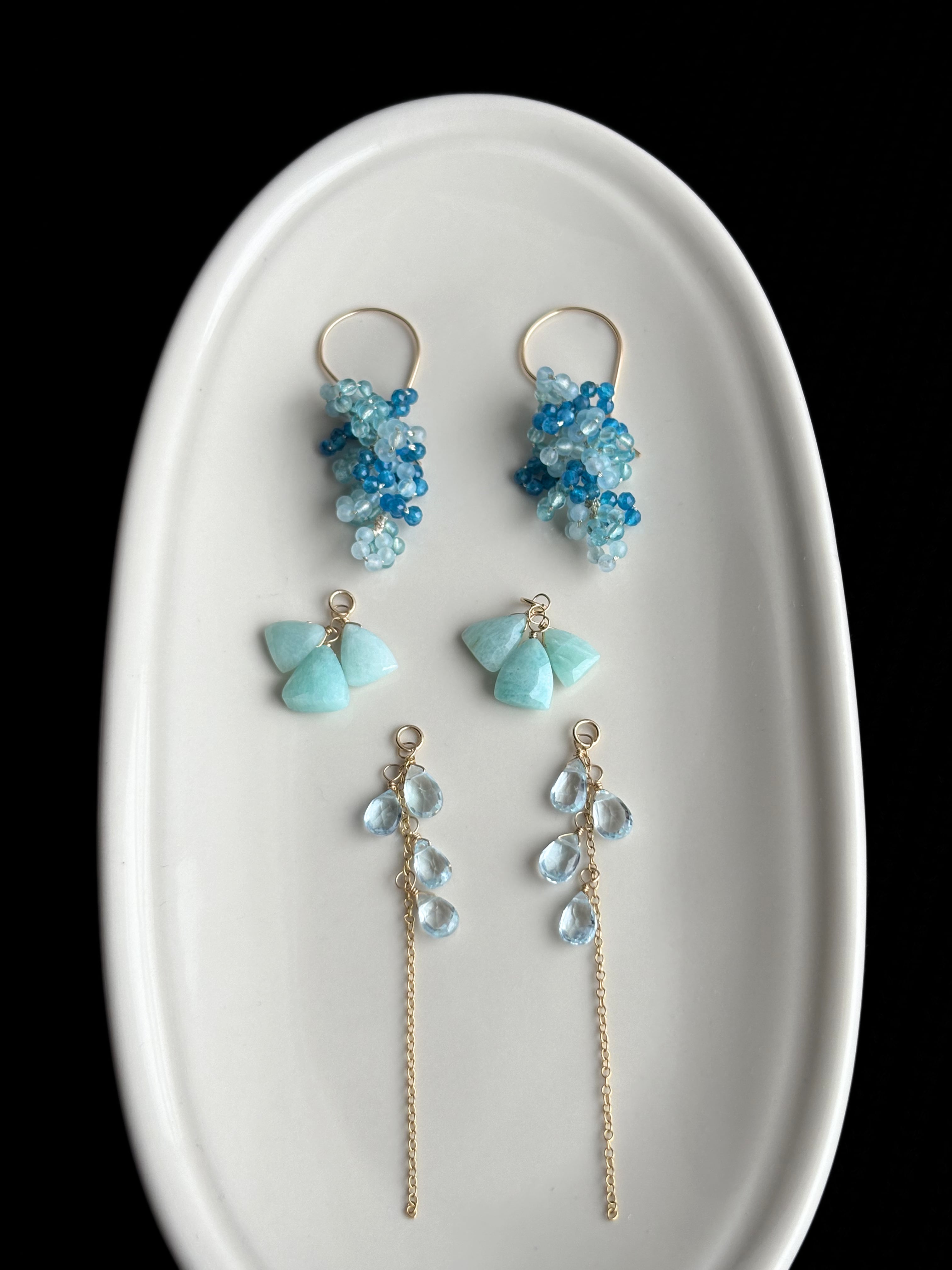 こちらは、爽やかでピュアなライトブルーカラーの石を集めた、付け替え可能なピアスです。