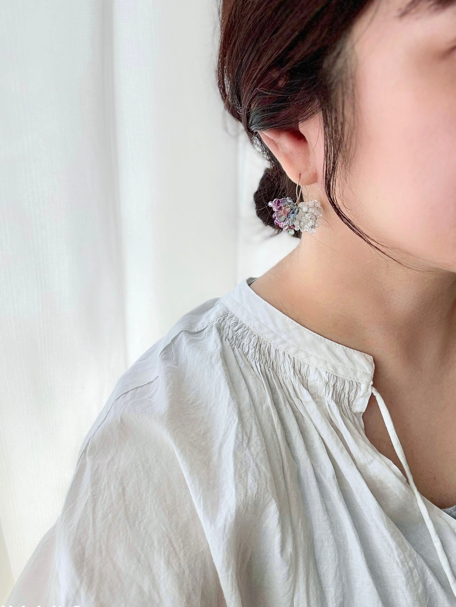 たくさんの小粒の天然石を一本の糸で編み上げた粒々なピアスです。