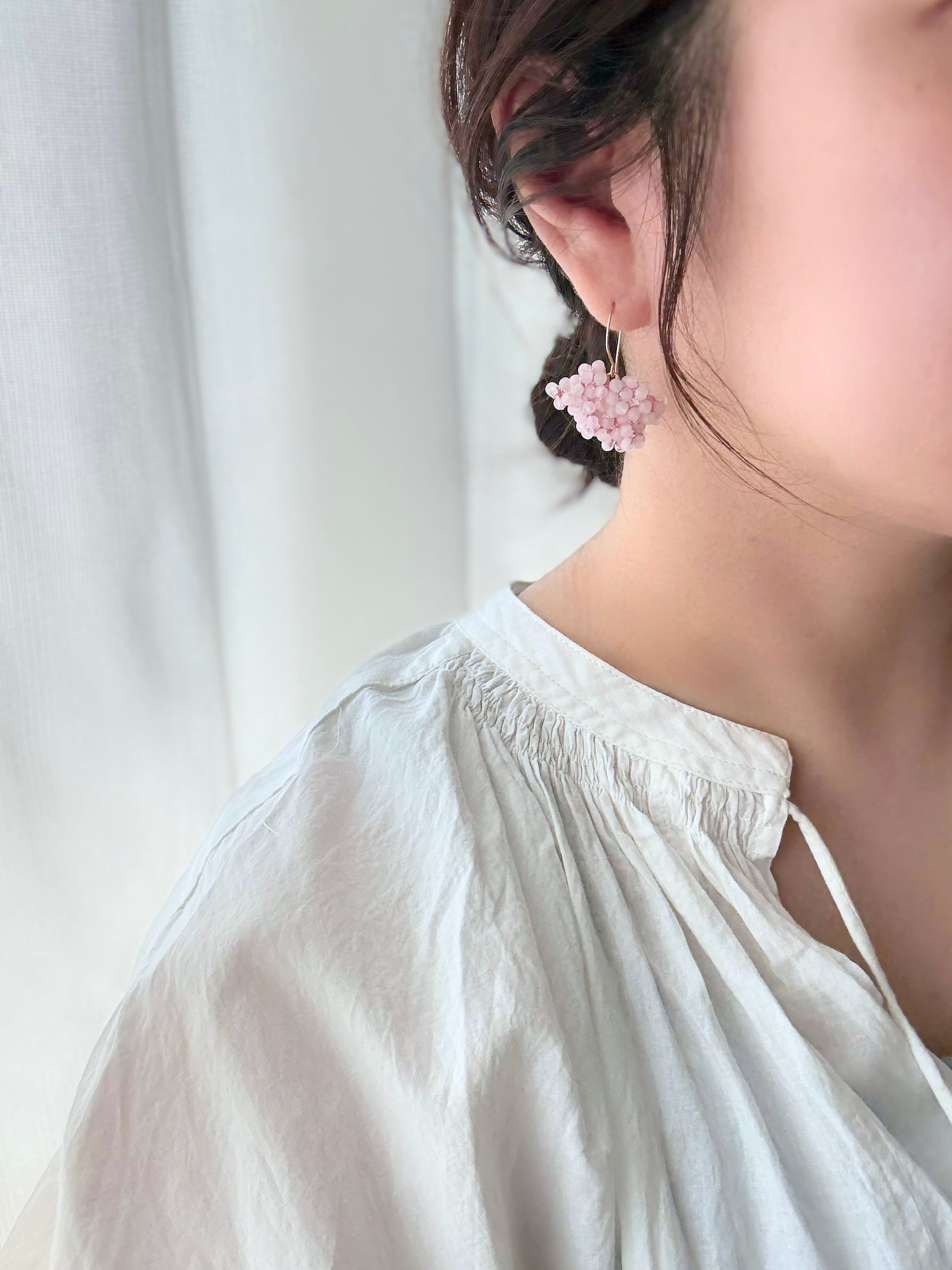 この粒の魅力は色だけではなく、フロスト加工されていることで質感がマットであるということ。このマットな質感により、甘すぎない大人でも身につけられるピンクのアクセサリーとなっています。
