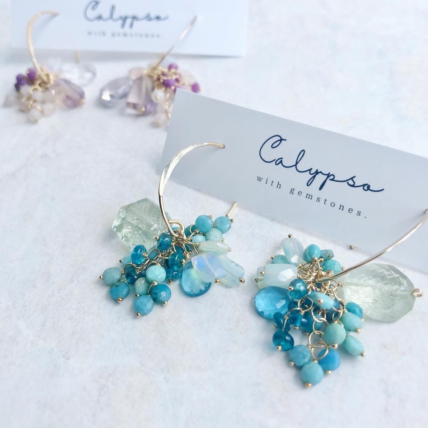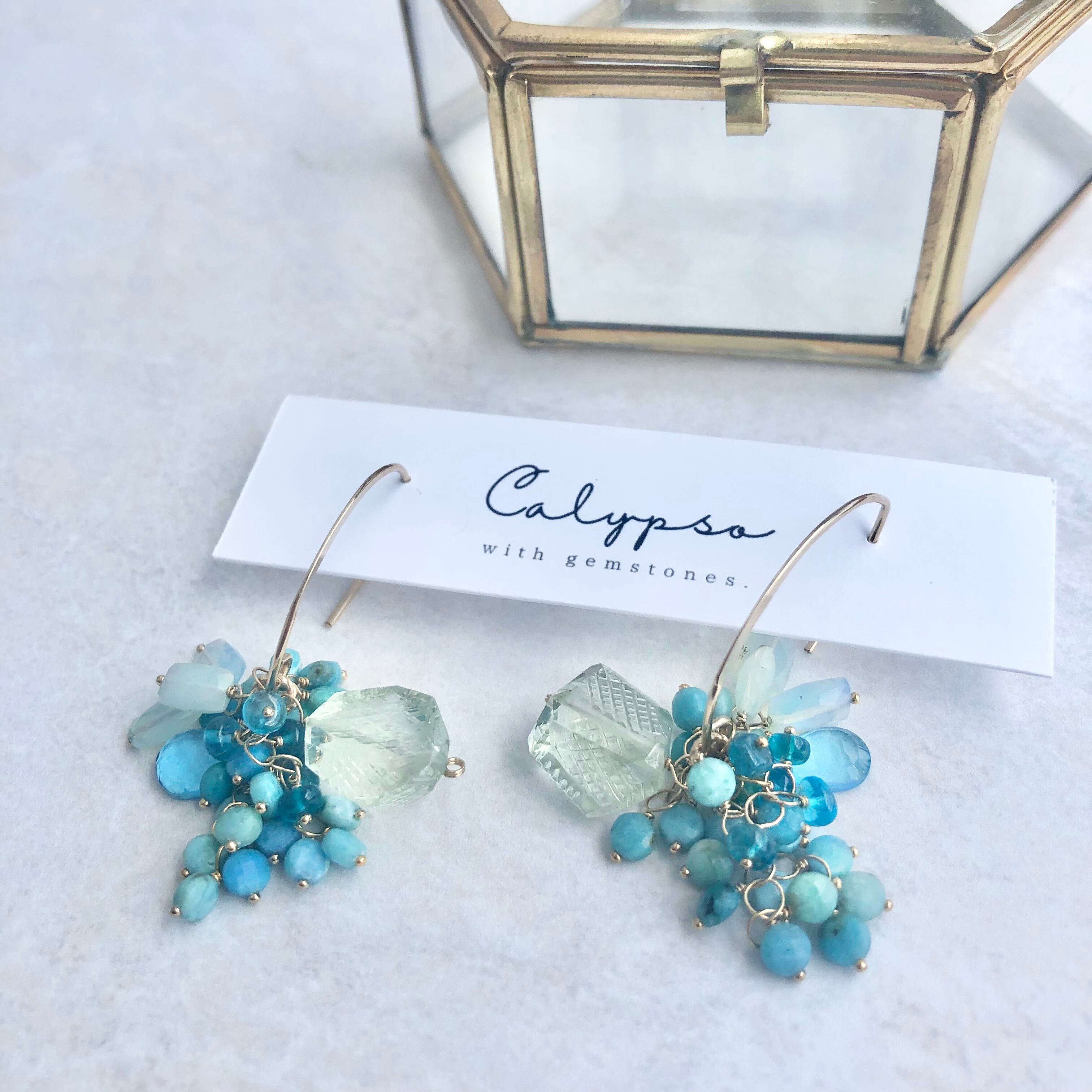 5種類の天然石を贅沢に組み合わせた、Calypsoお得意の青系のブーケピアス。鮮やかなブルーと優しいライトグリーンの調和が美しく、清涼感のある作品となっています。