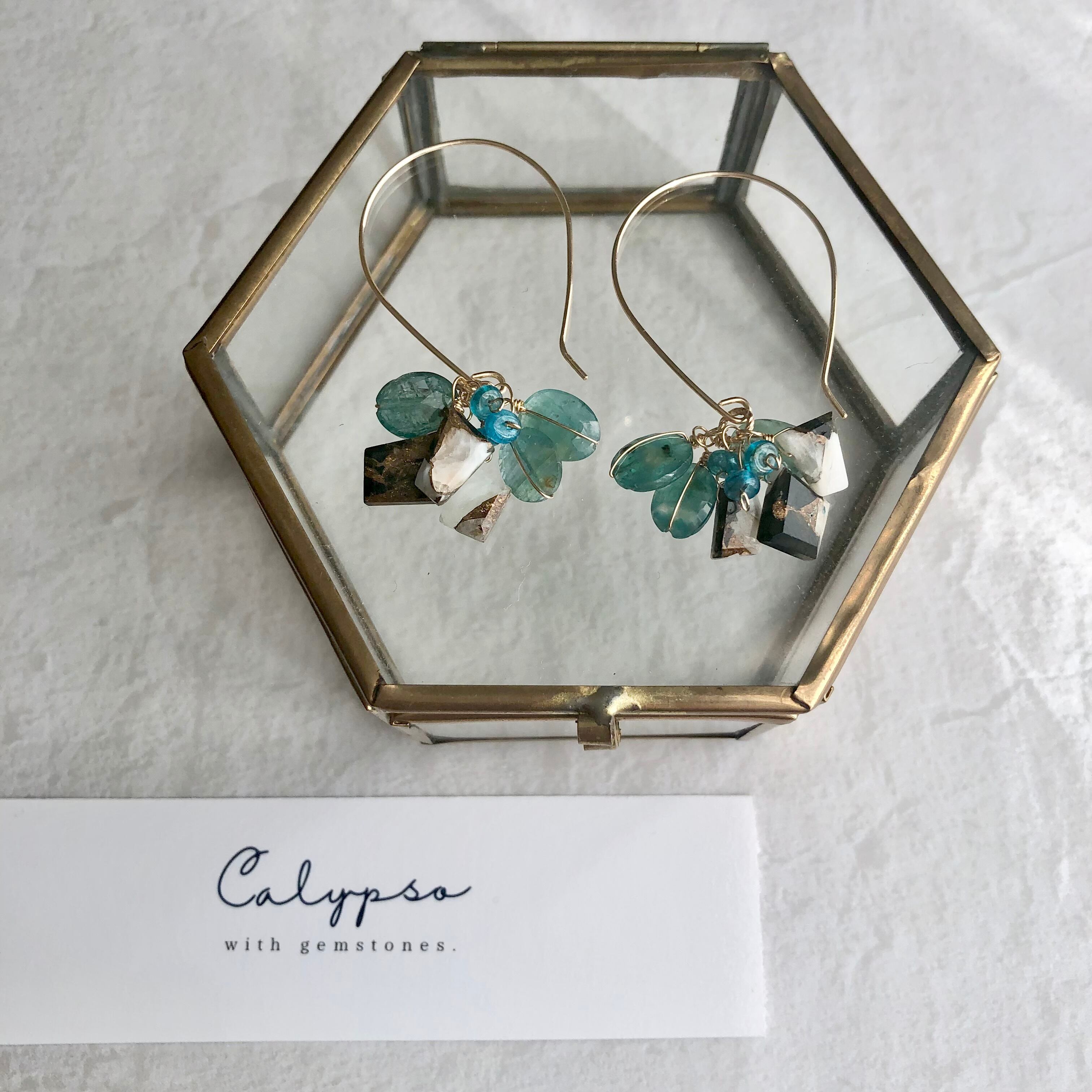 一粒一粒模様が異なるコッパーカルサイトオブシディアン。黒はあまりCalypsoでは使わない色ですが、グランディディエライトの綺麗な緑と鮮やかなネオンブルーアパタイトの小粒を使用することで重たい印象にならないようにしました。