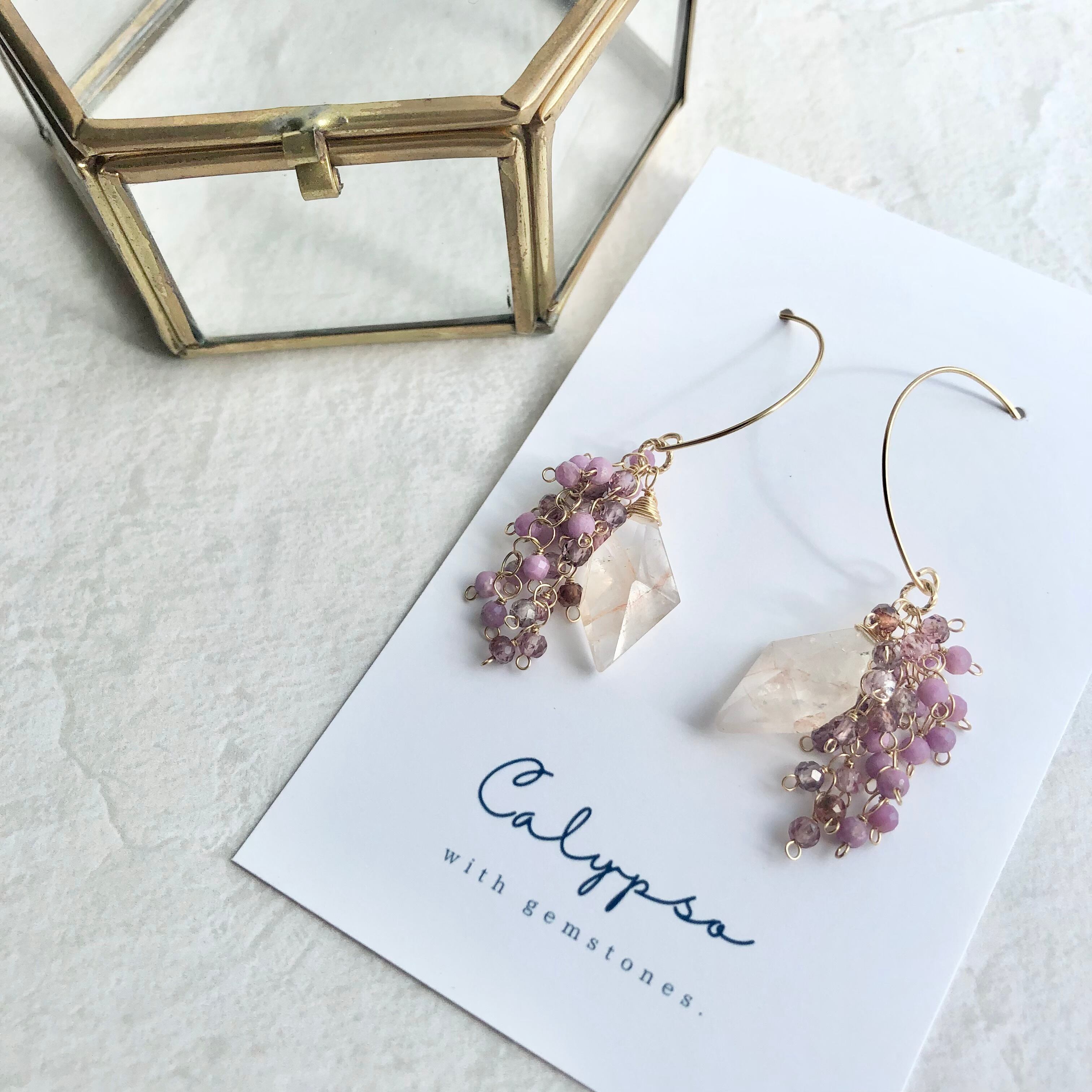 石好きの方ならご存知かもしれませんが、マルチカラースピネルは希少で高価な石。今回は、透明度も発色も申し分ないマルチカラースピネルの小粒をたっぷり使いました…!フォスフォシデライトのピンクとの相性も抜群です。
